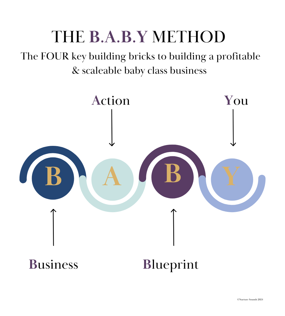 B.A.B.Y stands for Business, Action, Blueprint and You and it's my touchstone which helps me to decide exactly what to include in my courses - I know a lot of 'stuff' I don't include btw!  I believe there is no point writing a course that will teach you 'just' how to set up a baby class business, or 'just' what songs to sing, activities to choose or 'just' how to fill classes or 'just' how to deliver classes.  I'm far more interested in a holistic approach because I know that unless my students feel comfortable and confident in all four of those areas they can't deliver the incredible baby classes that babies and new parents deserve & live their best lives 'sat at the front of the circle'